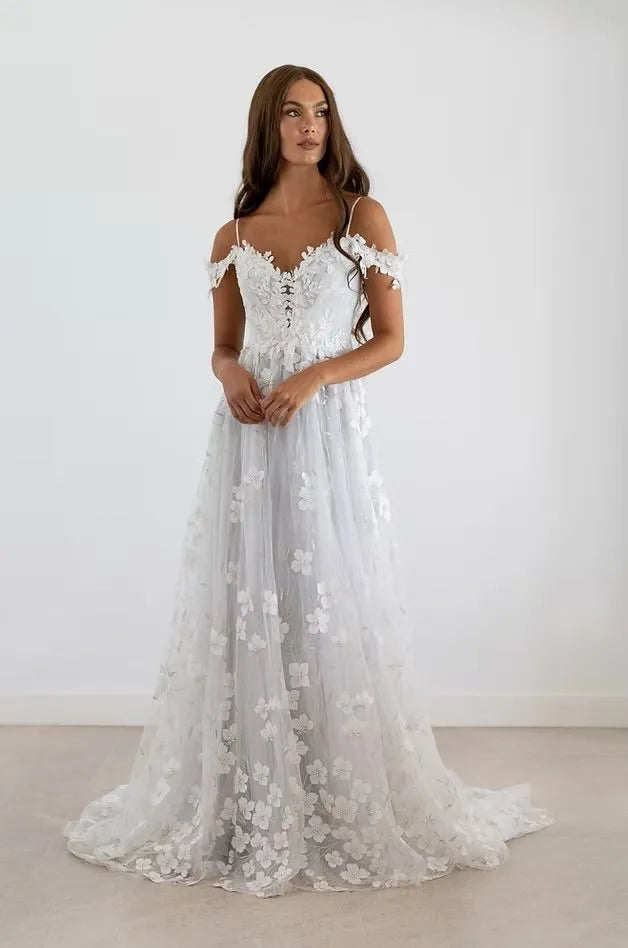 Whimsical A-Line gown adorned with exquisite 3D beaded florals. Feminine concealed plunge neckline and delicate drop sleeve.