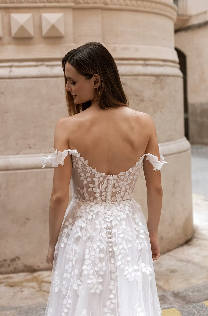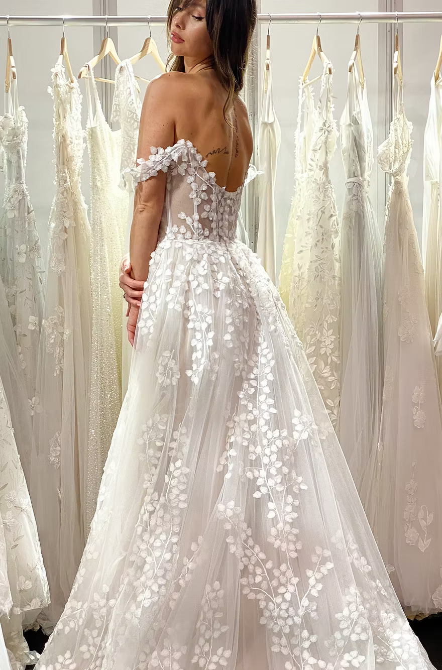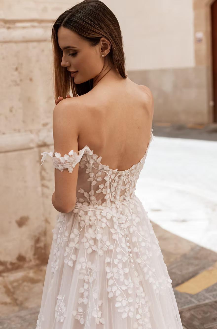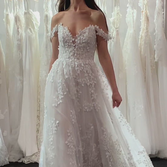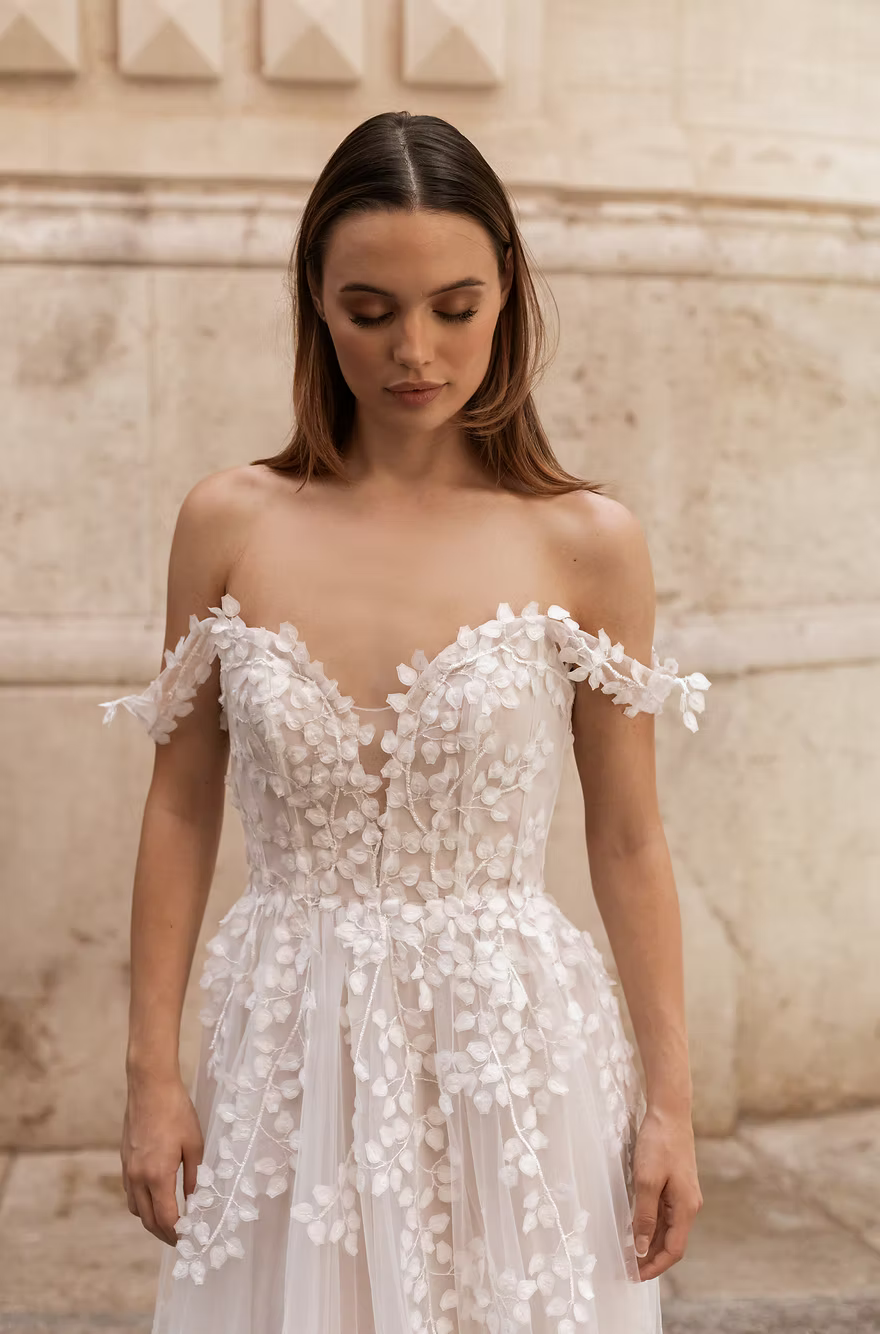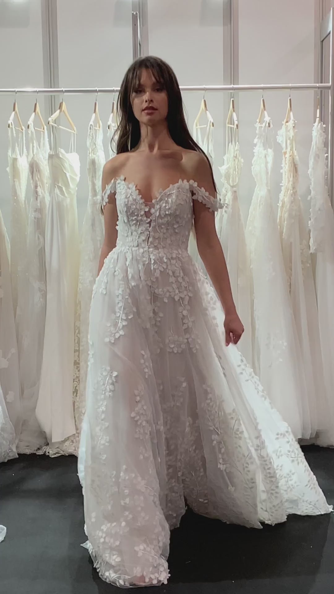 Beautiful, ethereal Haven features laser cut 3D florals, a floaty A-Line skirt and delicate drop sleeve.