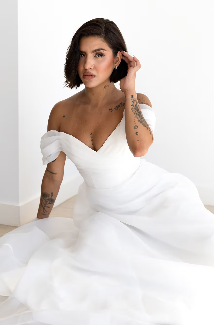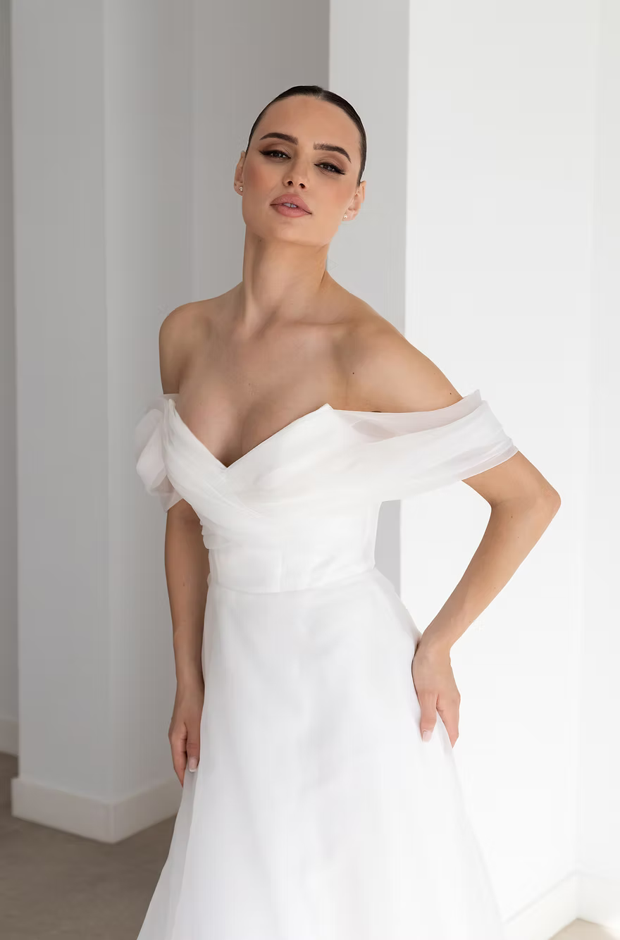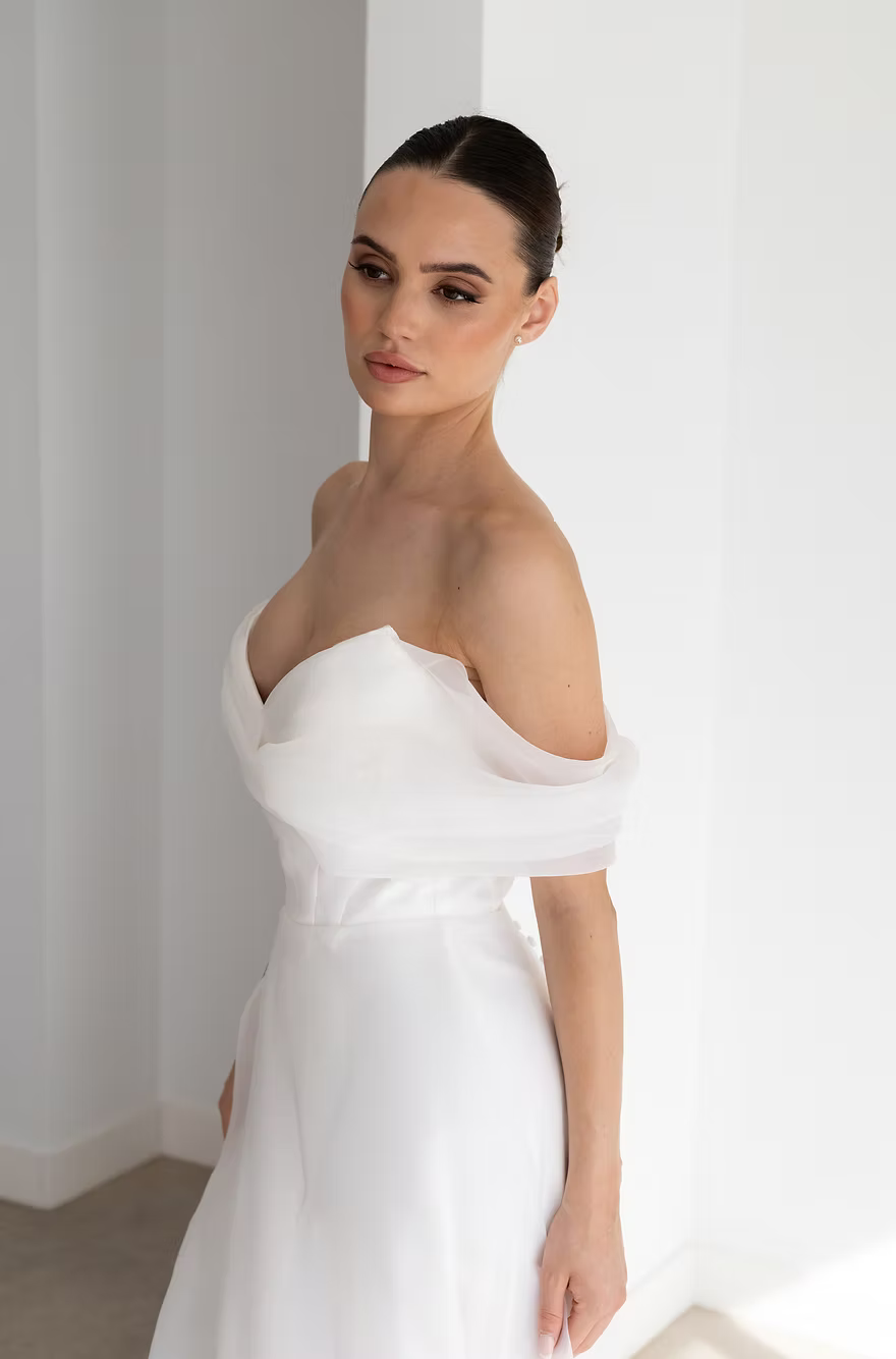 In dreamy organza, Inger drapes the body beautifully. Featuring a super flattering bardot neckline and floaty A-Line skirt. Super lightweight with a boned bodice for nice support.