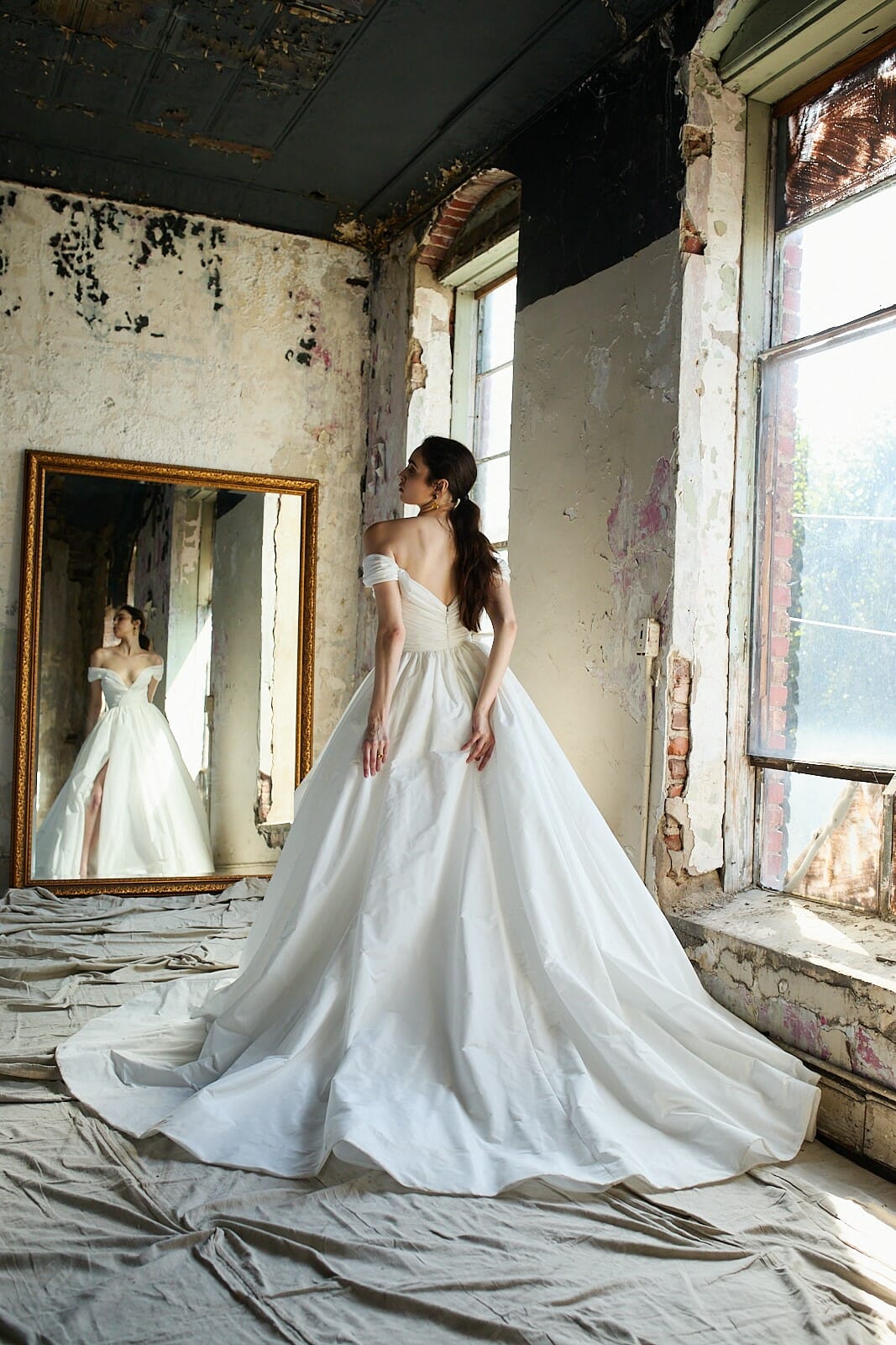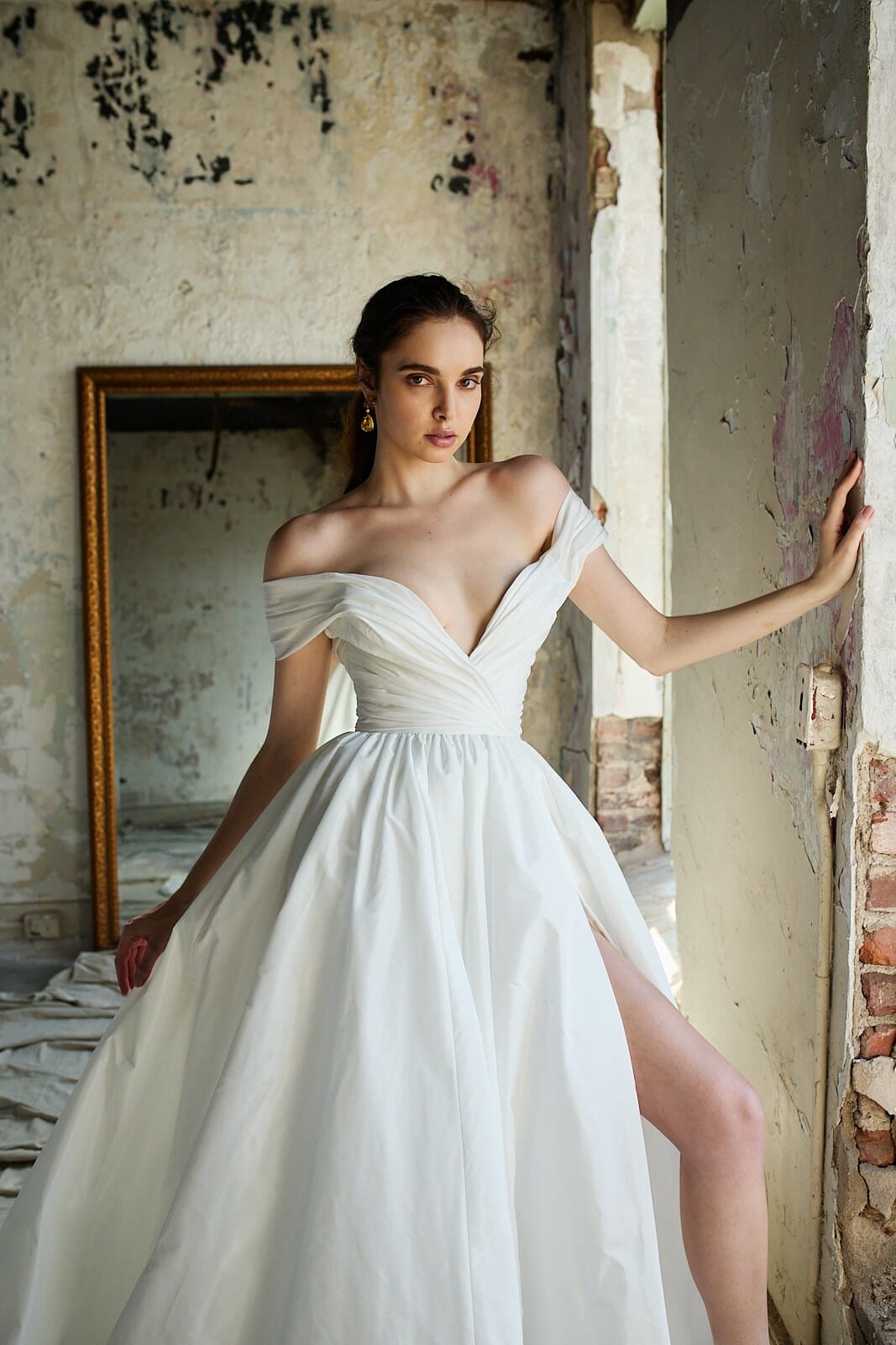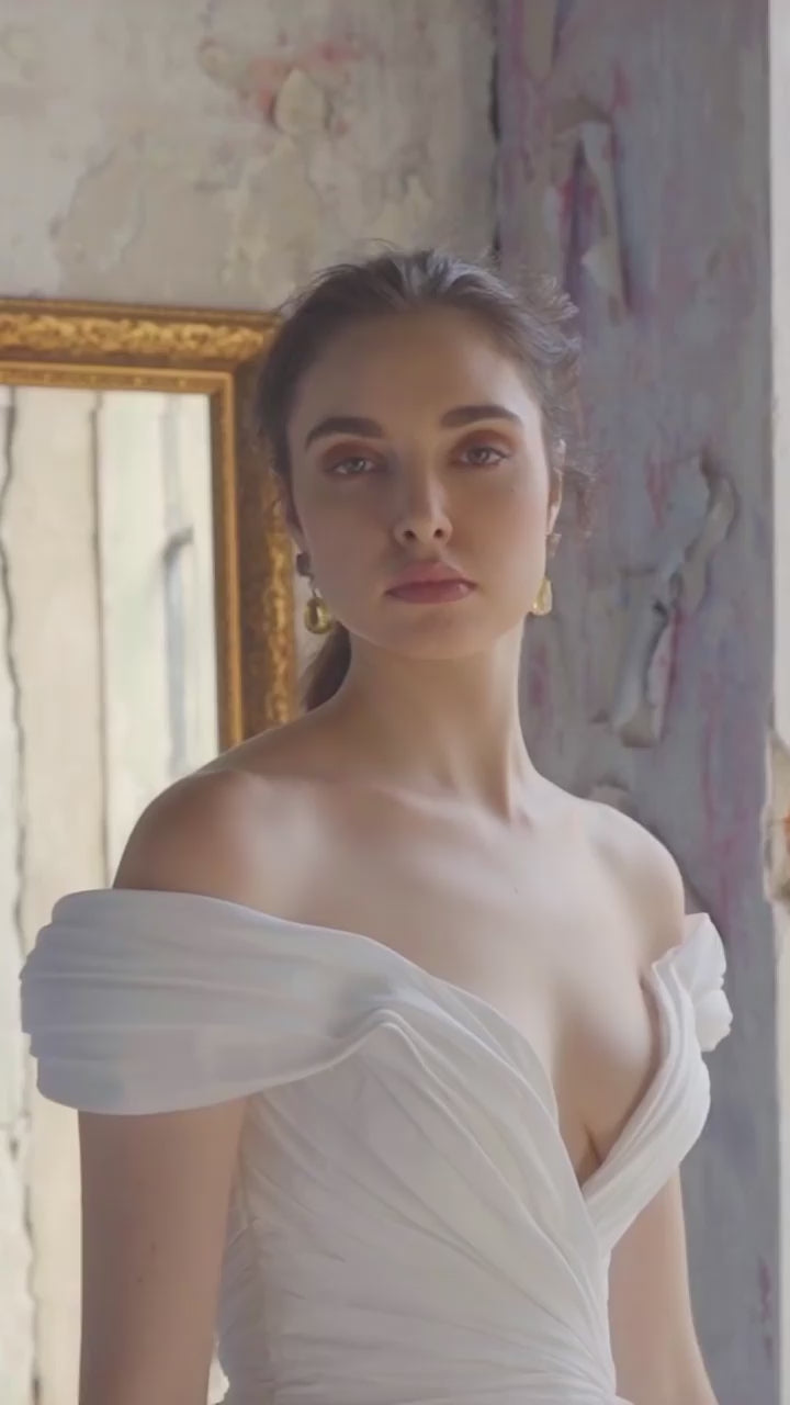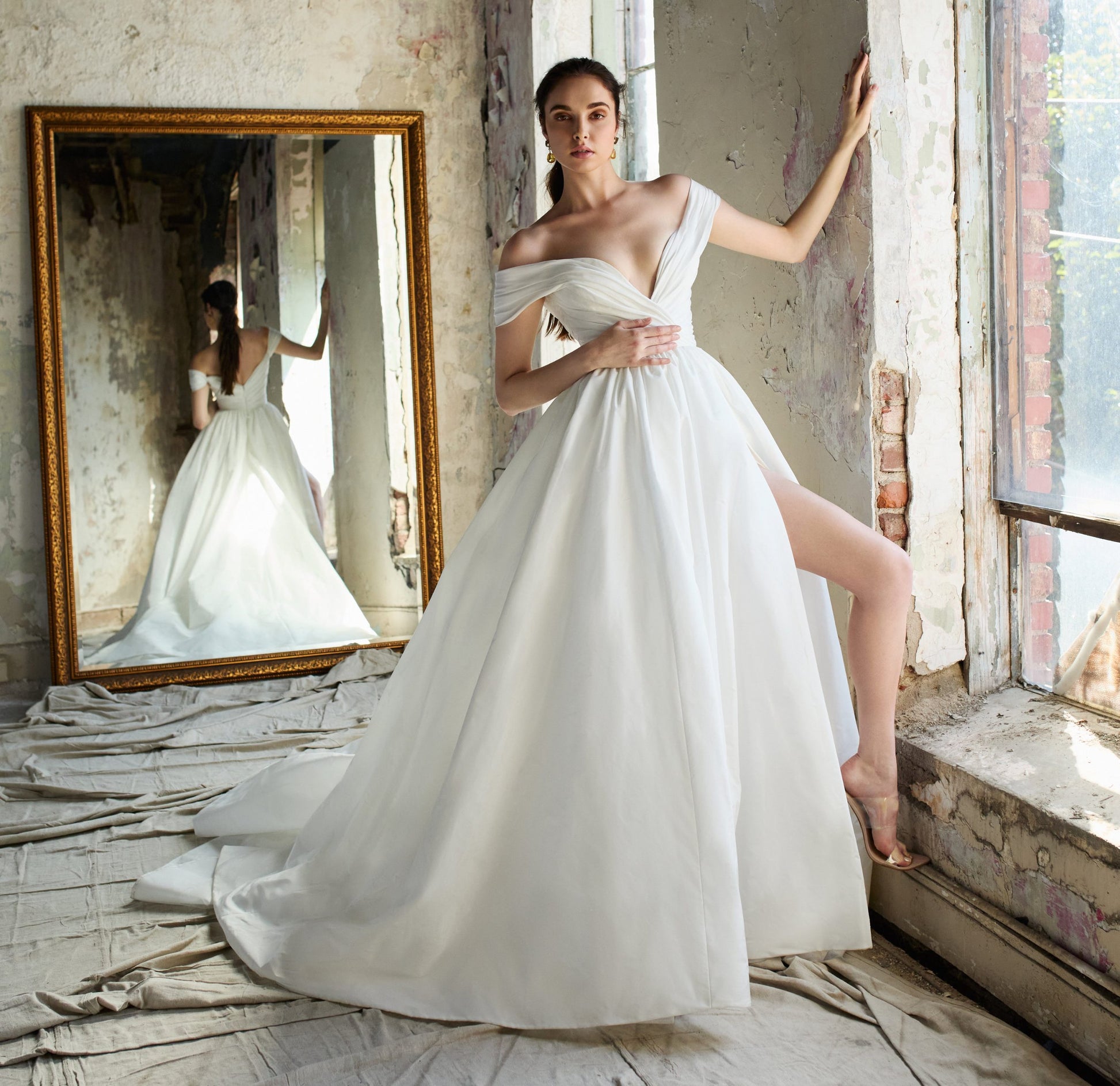 In rustling taffeta, Taylor is classic traditional meets modern chic. Featuring a flattering bardot neckline and ruched waist with a concealed leg split in the statement a-line skirt. This dress is crisp and fresh, for the bride who loves traditional style but with a younger feel.